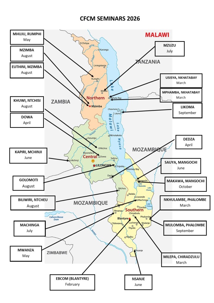 This Map shows the places where and the months in which CFCM Sunday school teacher training seminars are planned for 2026. This year, CFCM trainers will be returning to places where they have already started to train the teachers. In every destination marked on the map, they will be carrying out 2 days of training to complete Level 2 and Level 3.